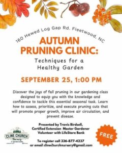Discover the joys of fall pruning in our gardening classs designed to equip you with the knowledge and confidence to tackle this essential seasonal task. FREE class. Please call to register at 336-877-4237 or email us [email protected]