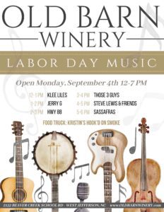 Come join us at Old Barn Winery where we are hosting 6 local music groups on Labor Day Monday. We will have music all day long and Kristin’s Hook’d on Smoke will be serving delicious food from 12-4pm. Music lineup is as follows:
