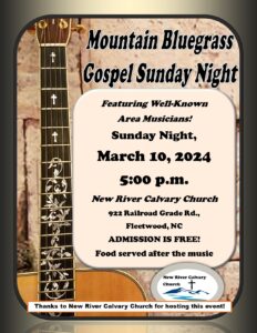 A night of bluegrass and traditional gospel music featuring many well known local musicians. Event is free and a meal is served after the music.