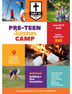 Event Description: Register now for the first annual overnight Pre-teen camp for students who have completed 3rd through 5th grade.