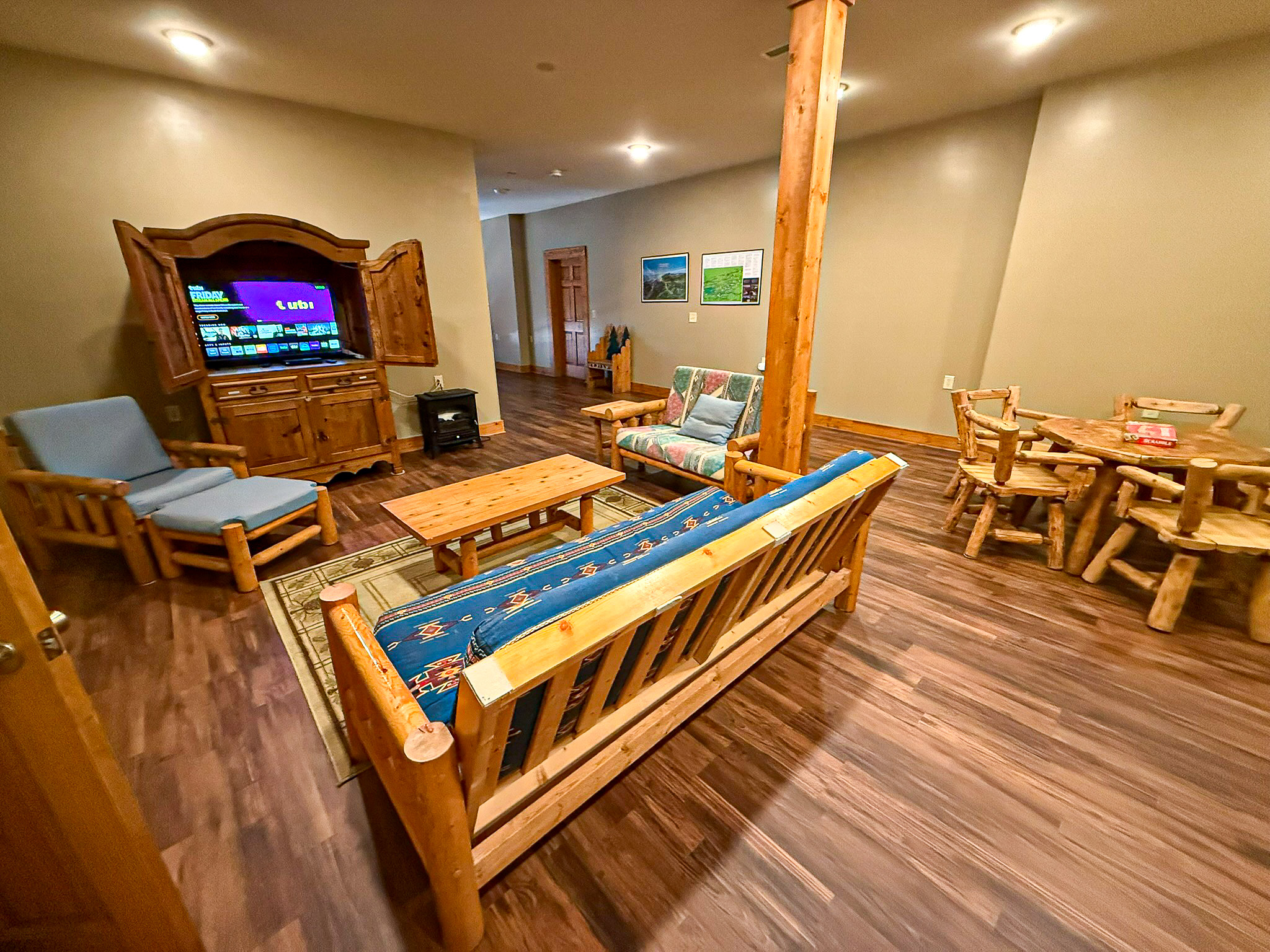 Downstairs, the game room is a favorite hangout spot, complete with a pool table, ping pong table, and flat-screen TV. After a full day of exploring, unwind in the 6-person hot tub on the lower deck and take in the quiet beauty of the surrounding forest.