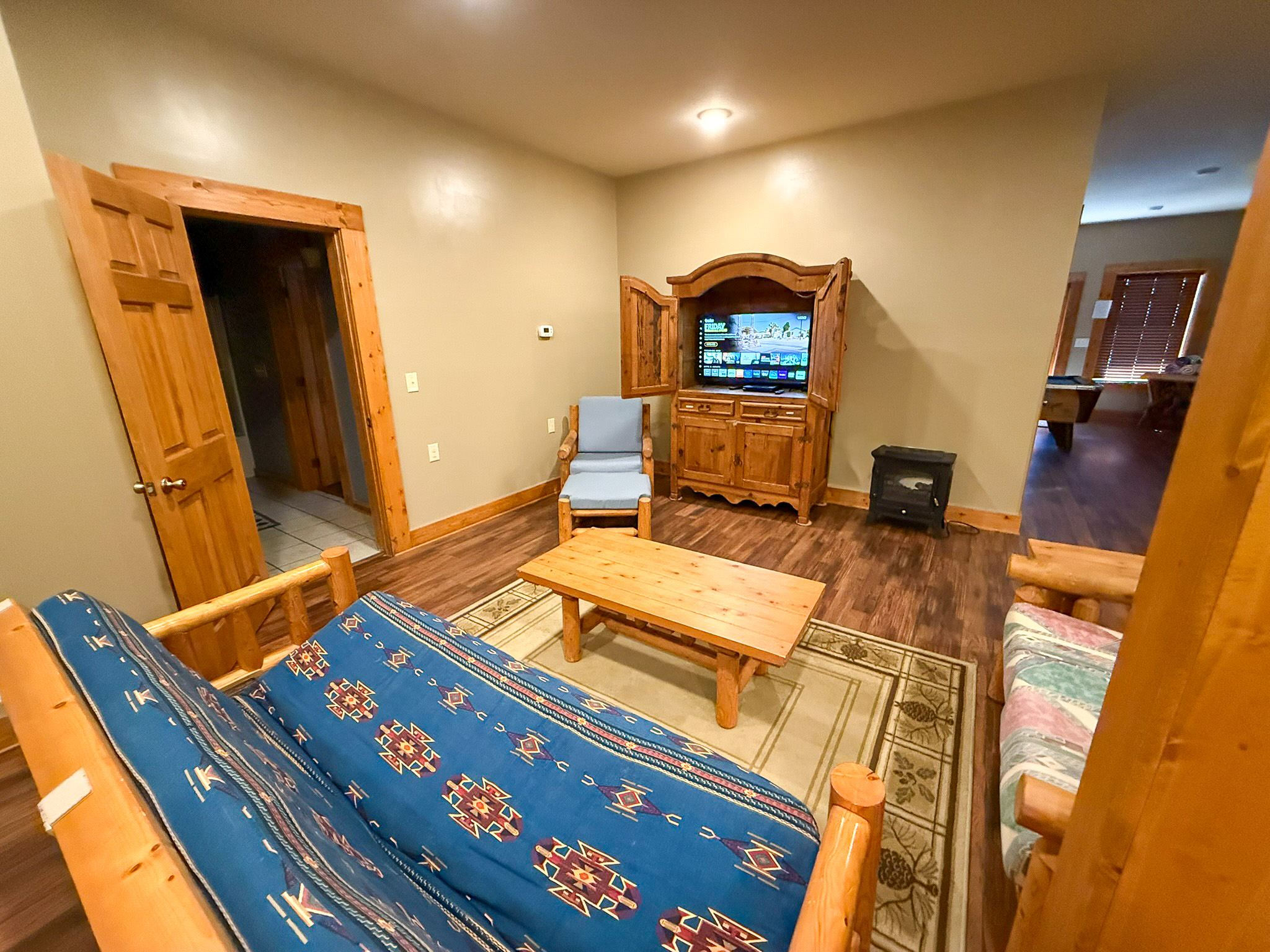 Lower Level Bedroom: Full and twin bed, plus a futon in the adjacent TV area