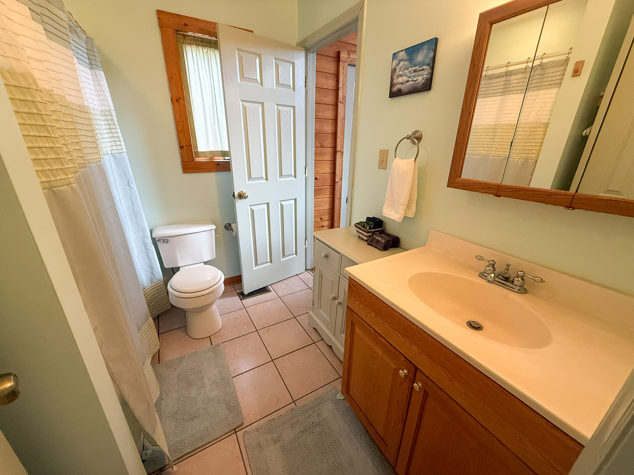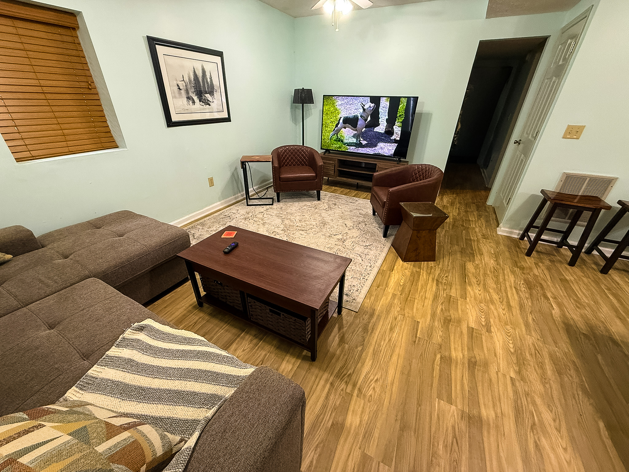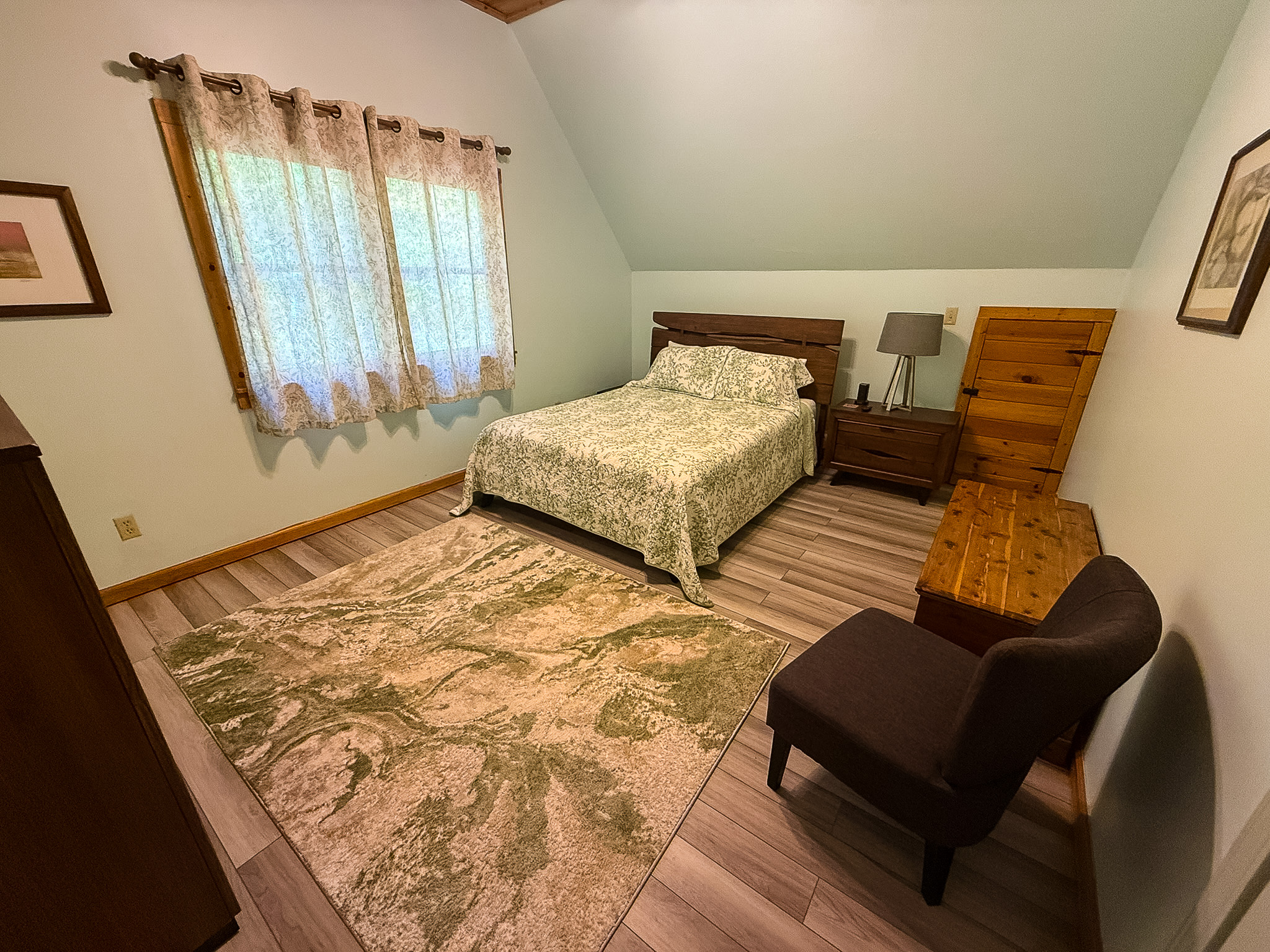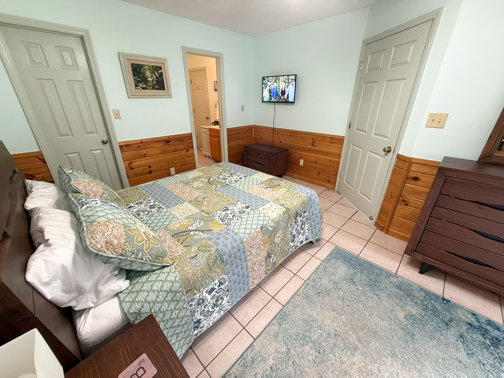 Upstairs, you’ll find another comfortable queen bedroom with a Smart TV and its own full bath, making it ideal for couples or additional guests.