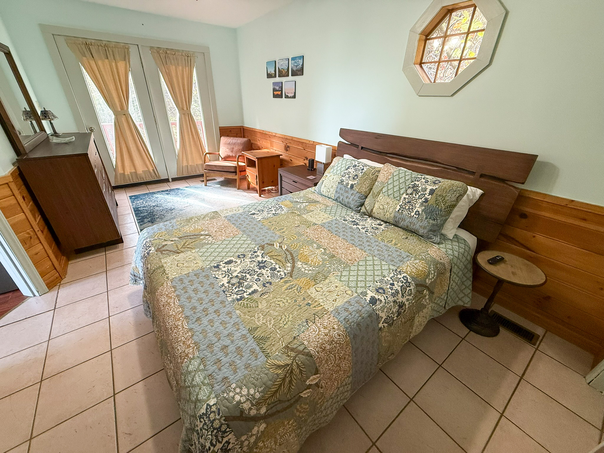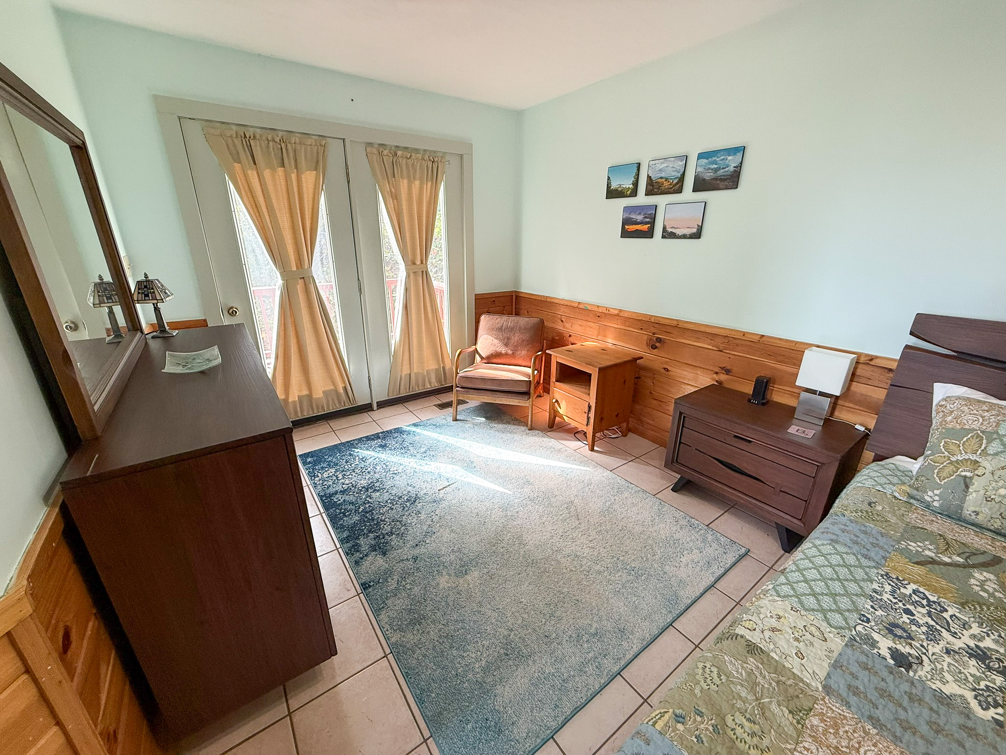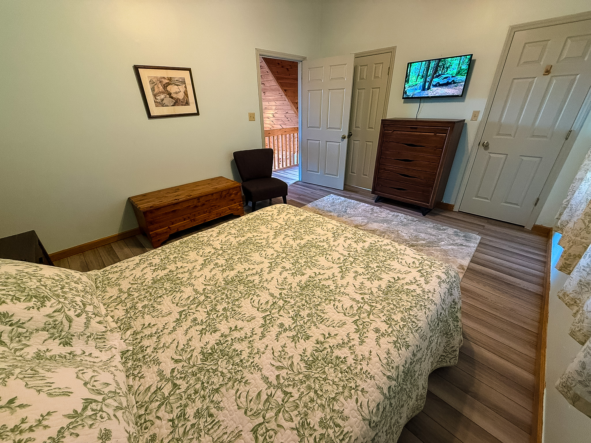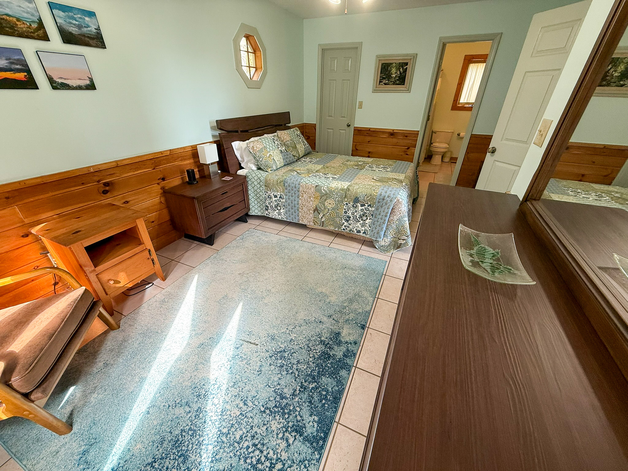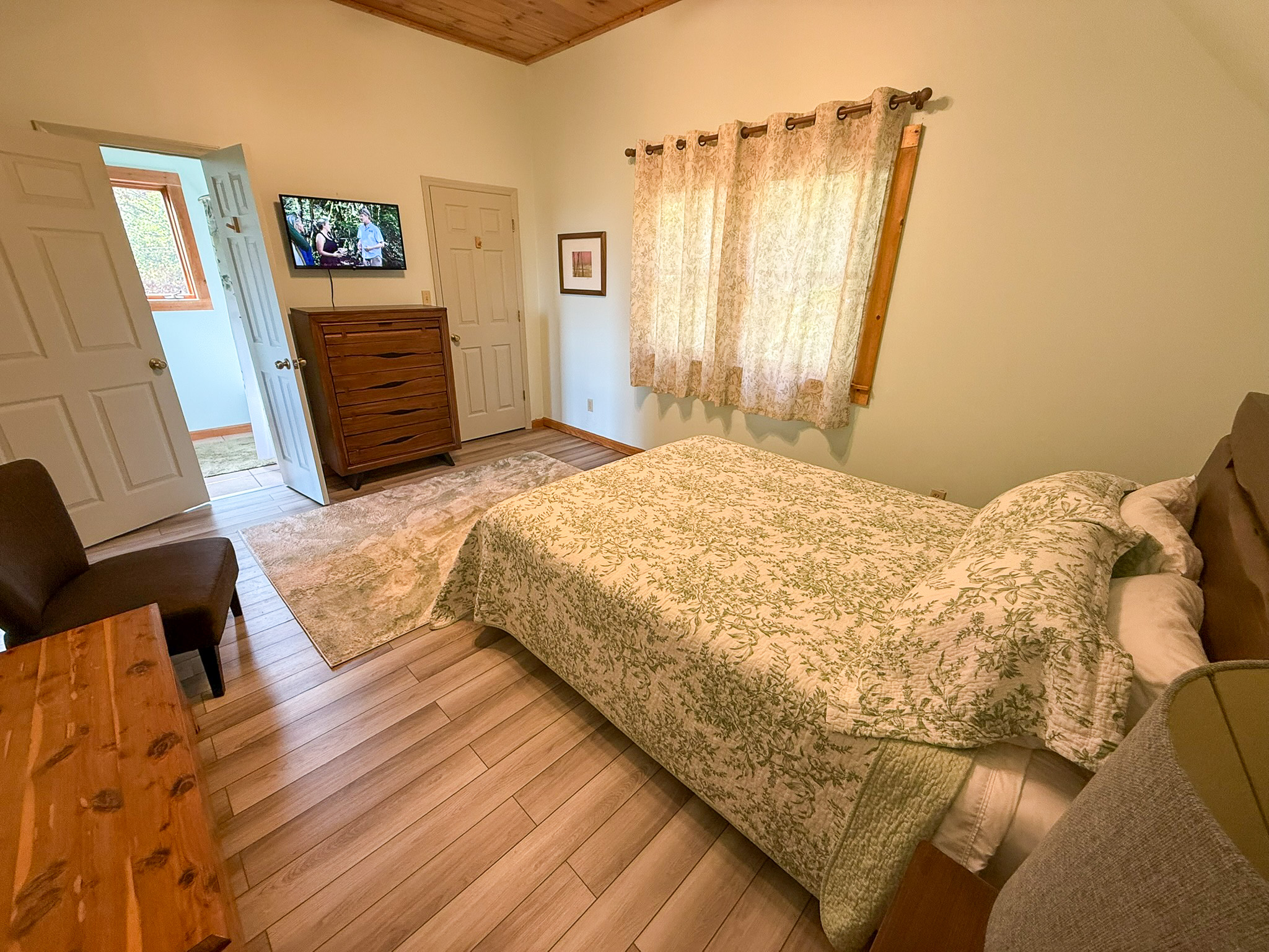 The main level features a spacious primary suite with a queen bed, Smart TV, and a private sitting area, perfect for reading or enjoying a quiet morning coffee. The en suite bathroom provides comfort and privacy.