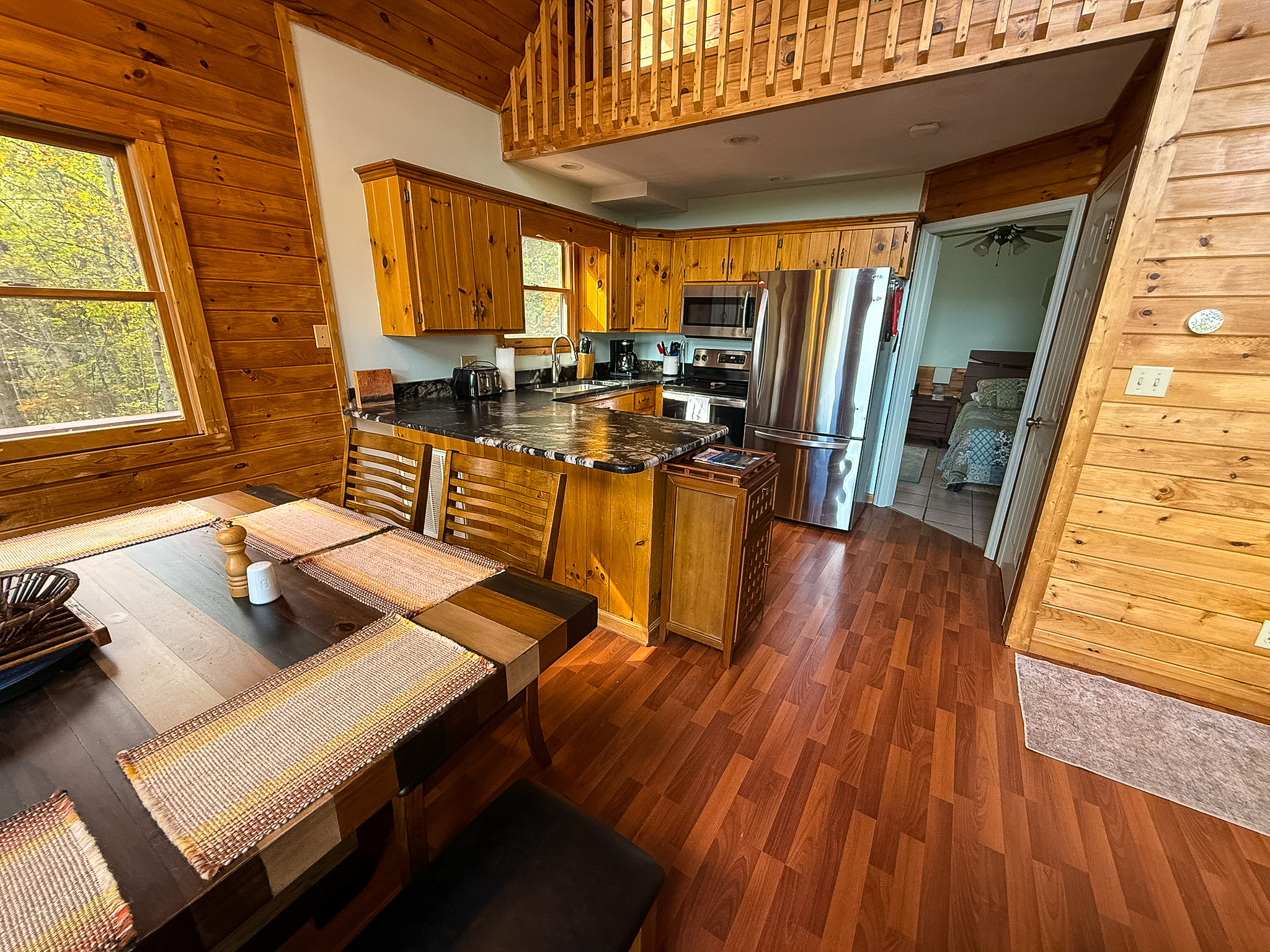 Step inside to an open, light-filled living area where large windows showcase stunning mountain views. The stone gas fireplace and Smart TV create a cozy space for relaxing after a day of exploring. The fully stocked kitchen includes stainless steel appliances, ample counter space, and all the cookware and essentials you’ll need, while the adjoining dining table provides plenty of room for shared meals and conversation.