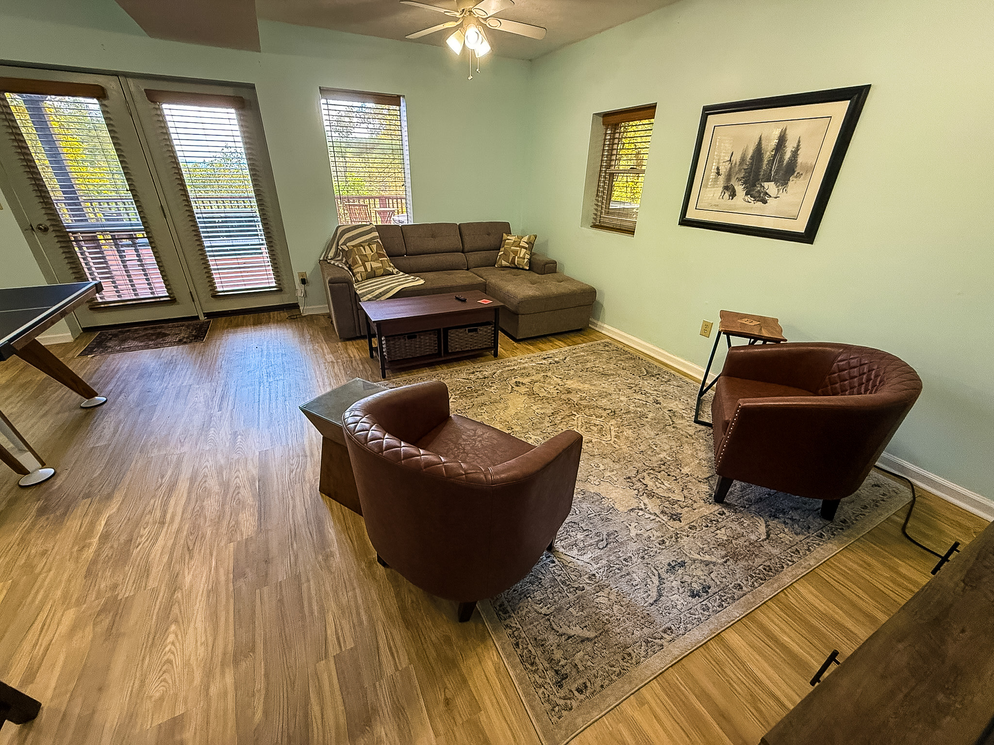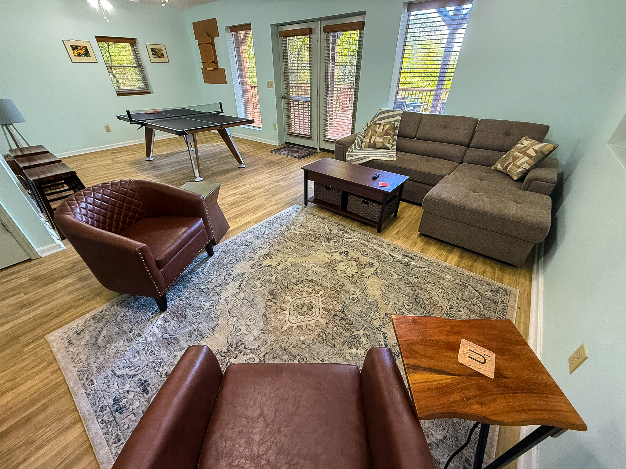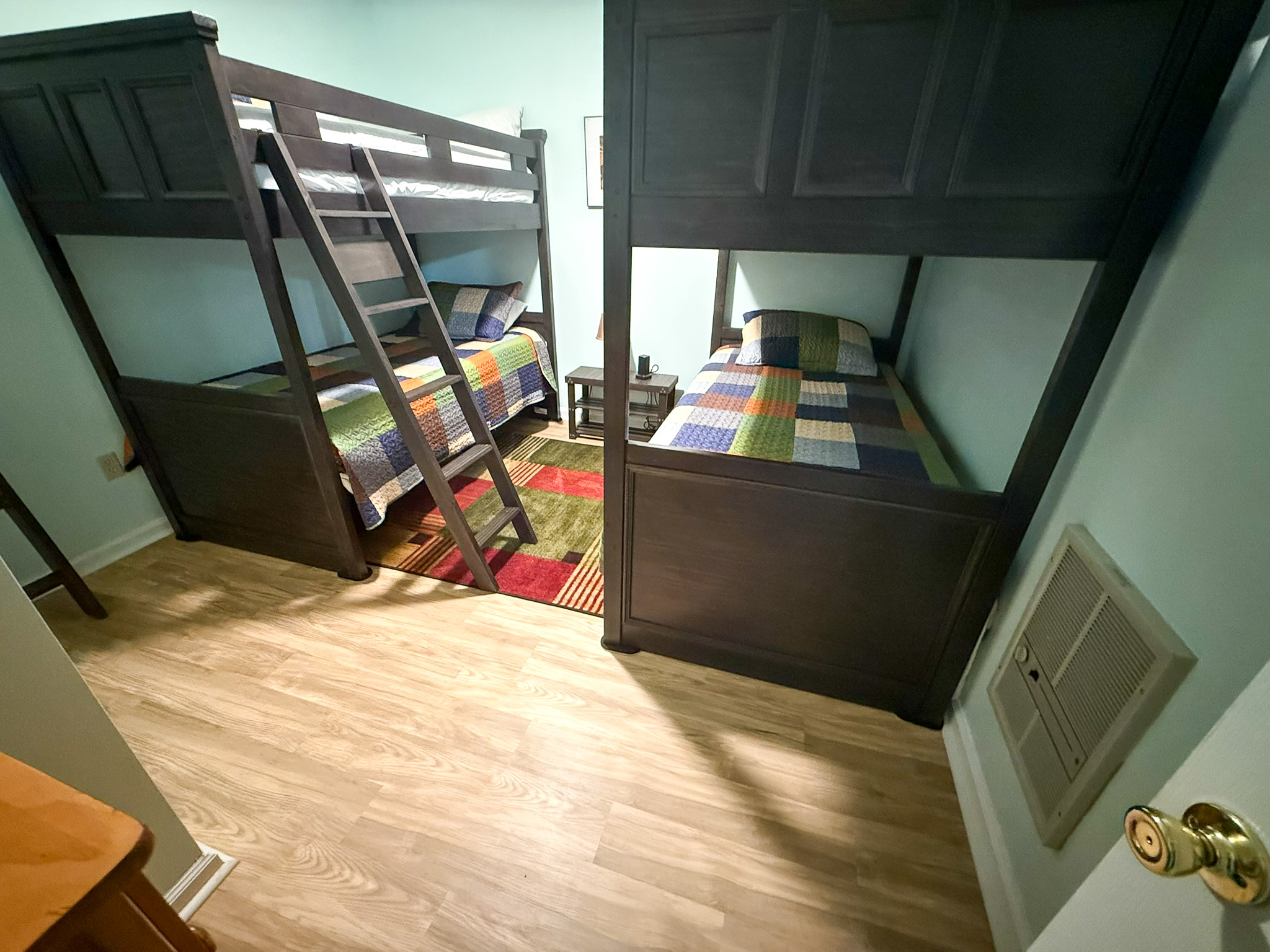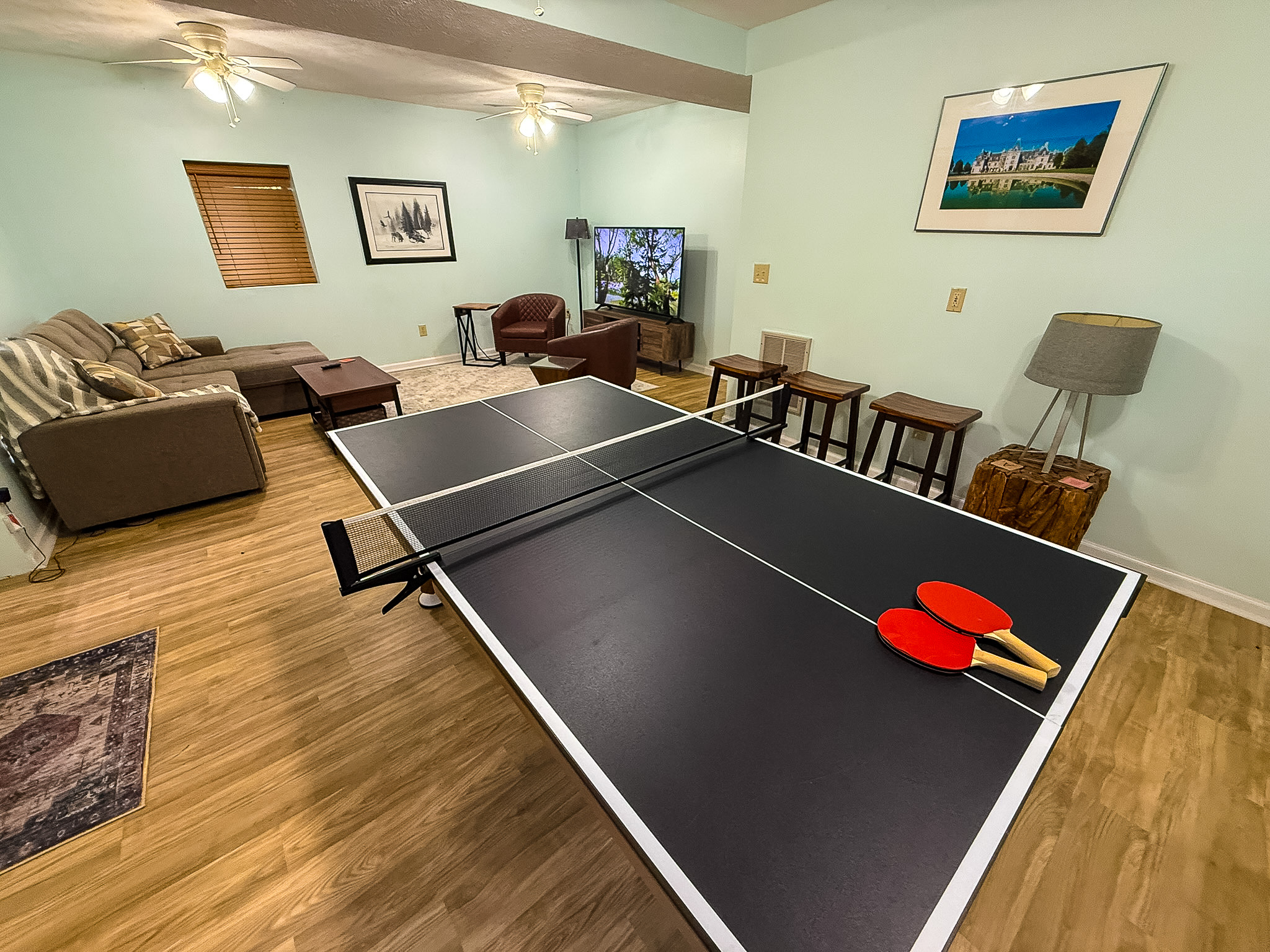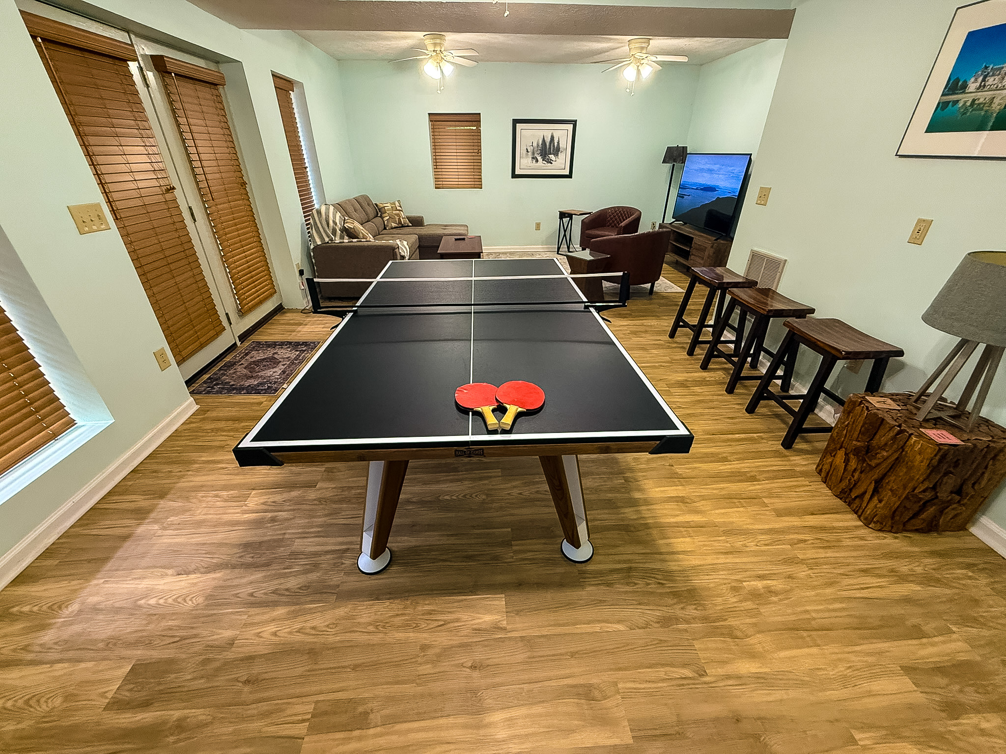Downstairs, the game room offers fun for everyone with a ping pong table and lounging space. The lower level also includes a bedroom with two sets of bunk beds and a full hall bath, creating the perfect spot for kids or a second family group. There is also a pull out couch on this level for additional sleeping space.