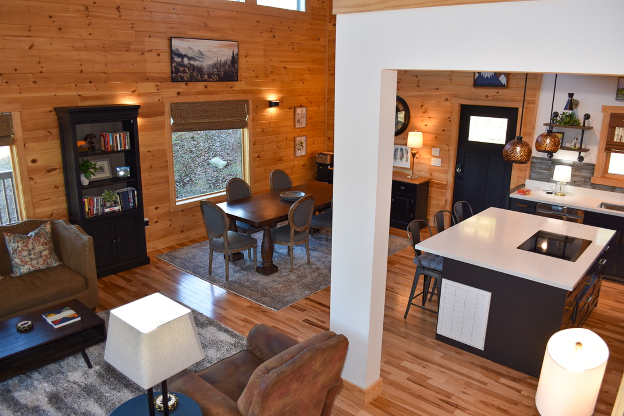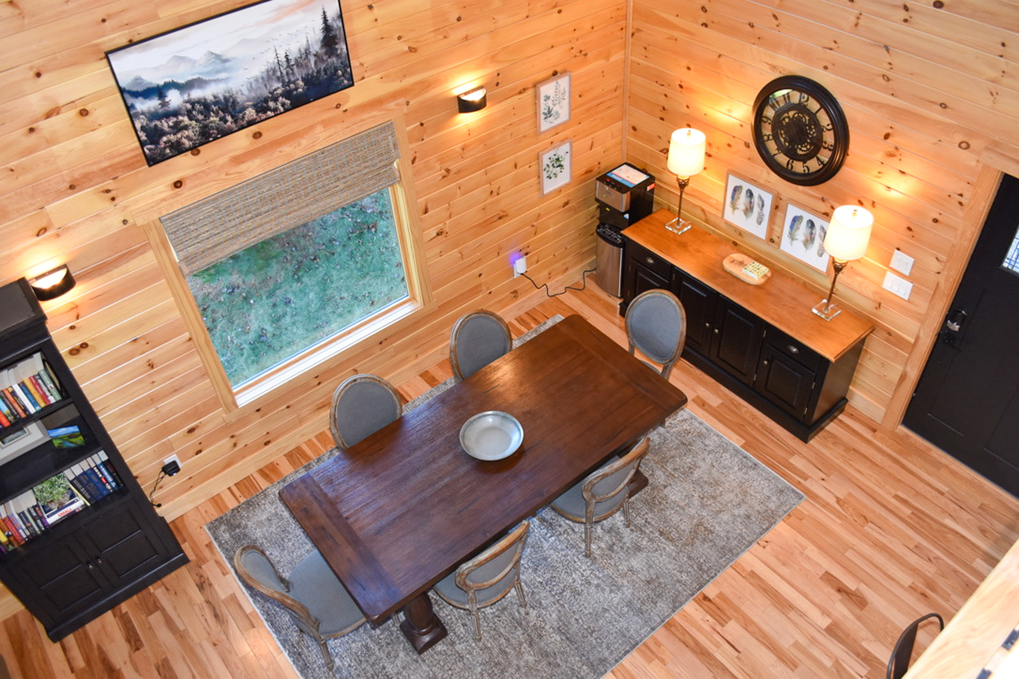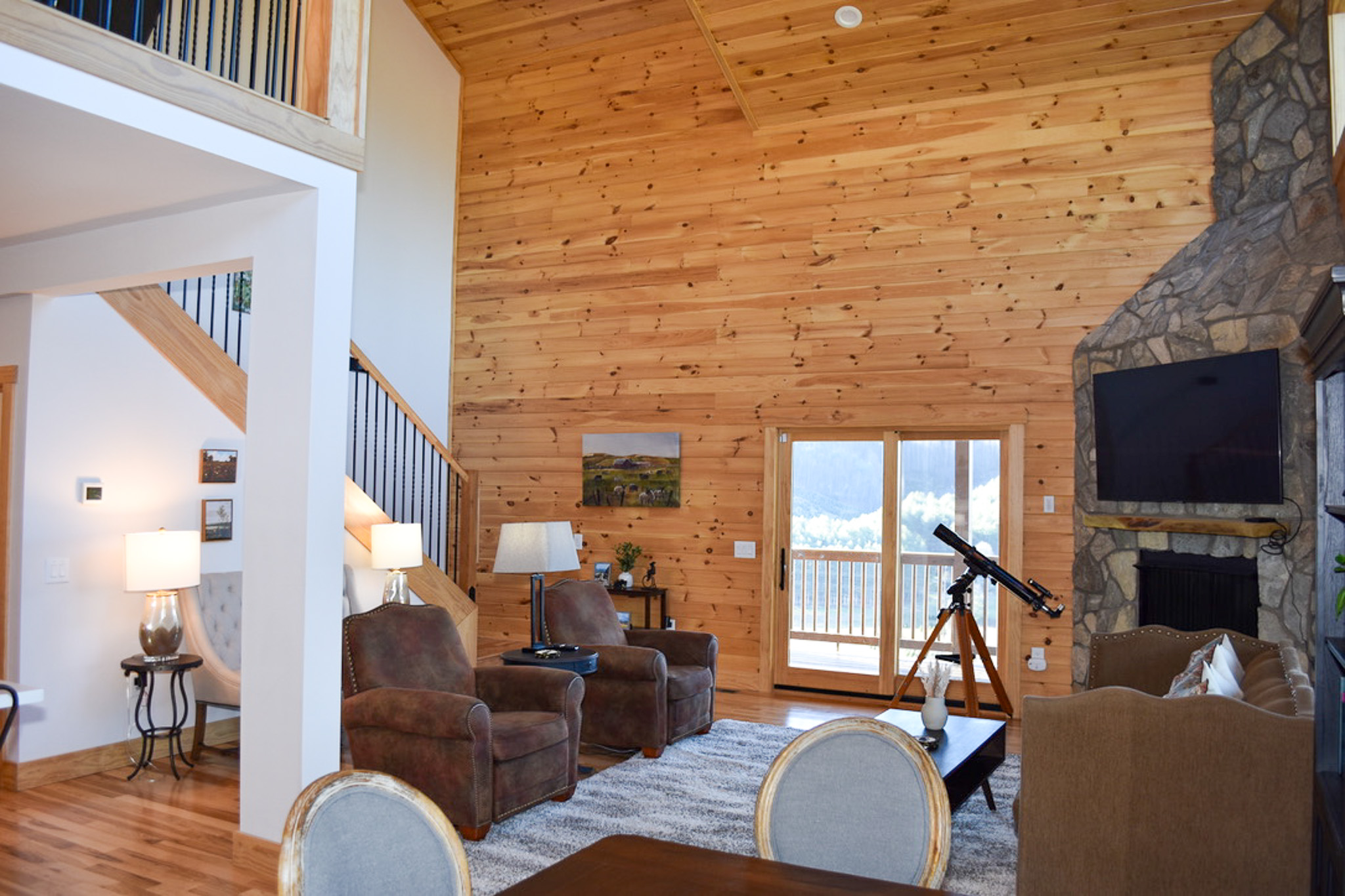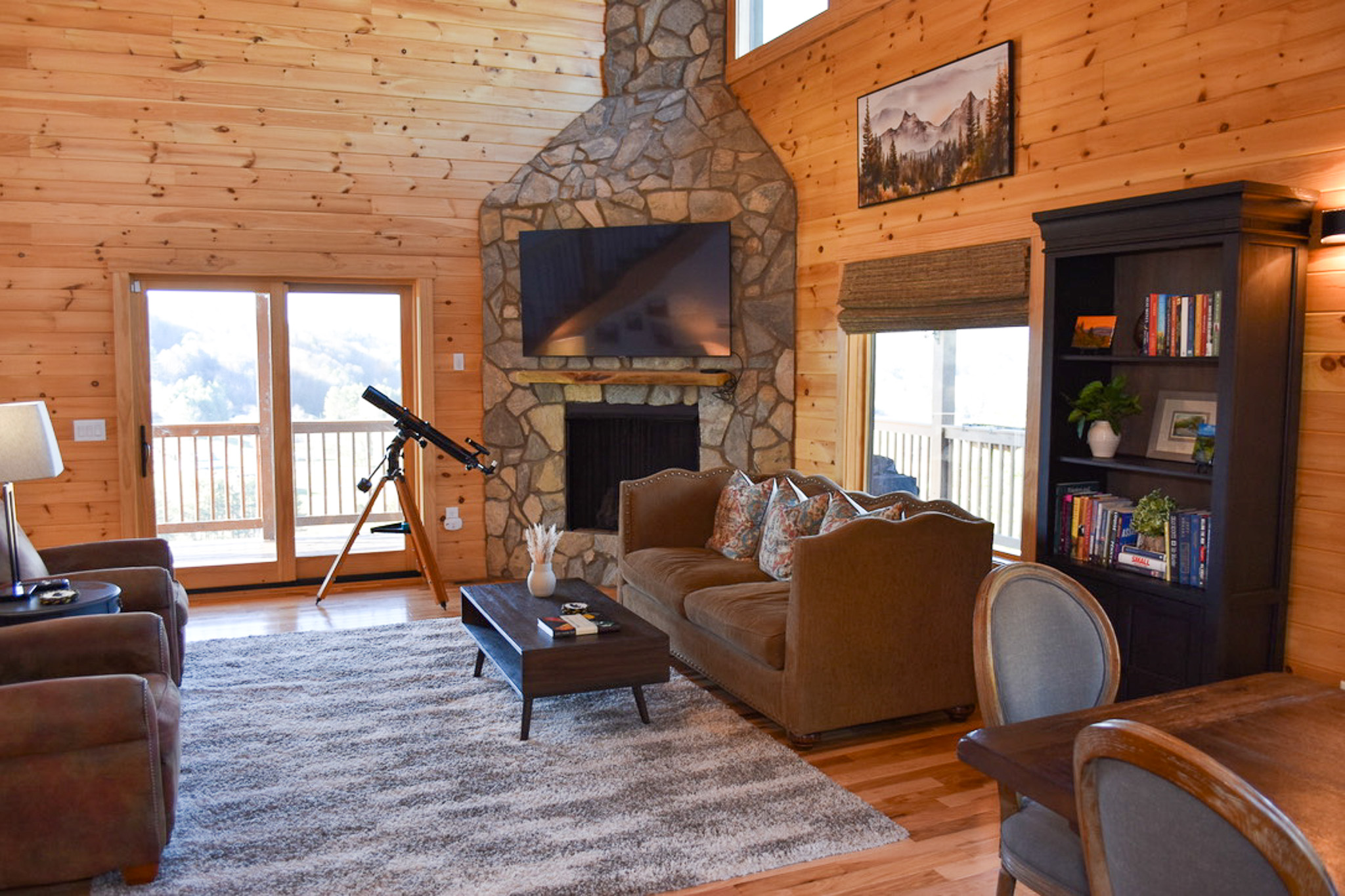 At the heart of the home, the chef’s kitchen is as functional as it is beautiful, featuring stainless steel appliances, custom painted cabinetry, quartz countertops, and a generous central island with bar seating. The adjacent dining area invites memorable meals together, while the grand living room impresses with cathedral tongue-and-groove wood ceilings and a striking floor-to-ceiling stone fireplace that adds warmth and character. Expansive windows and sliding glass doors flood the space with natural light and open effortlessly onto the decks, keeping the mountain scenery always within view. High-speed WiFi and large flat-screen TVs ensure comfort and entertainment throughout your stay.