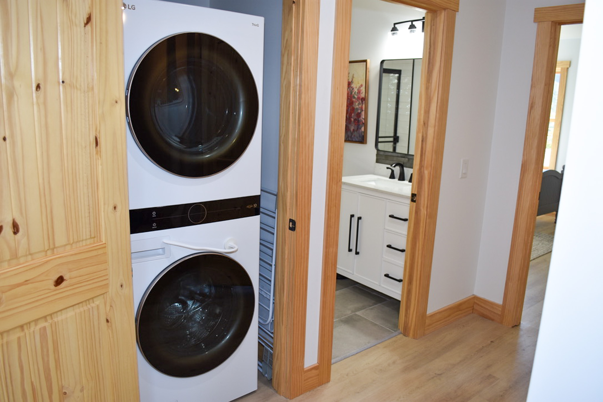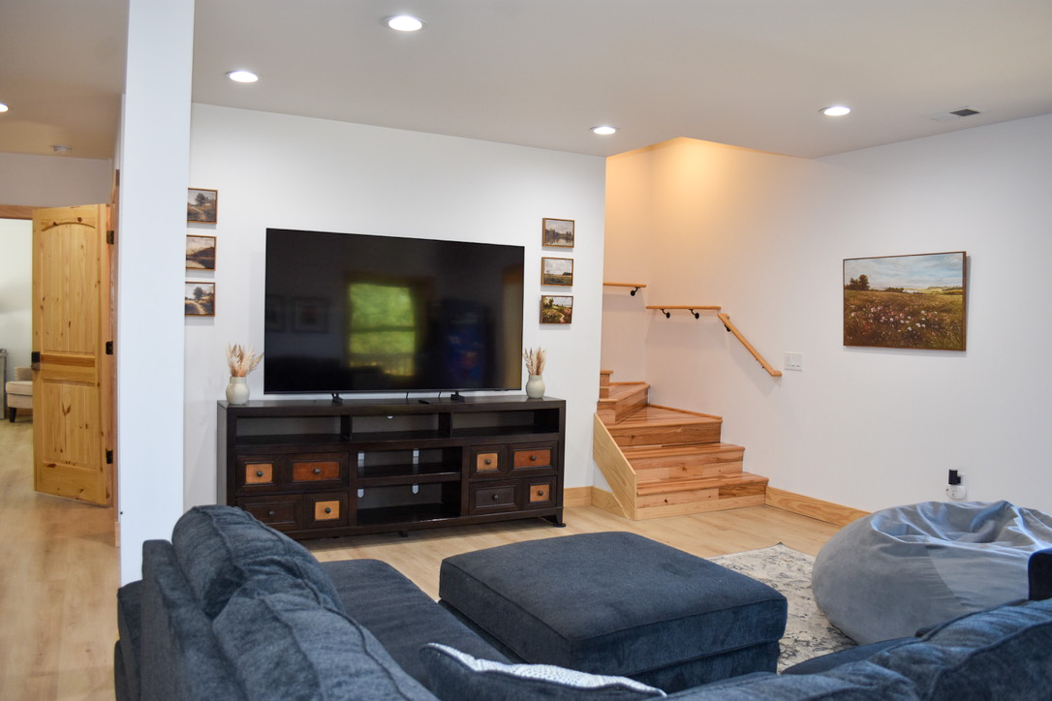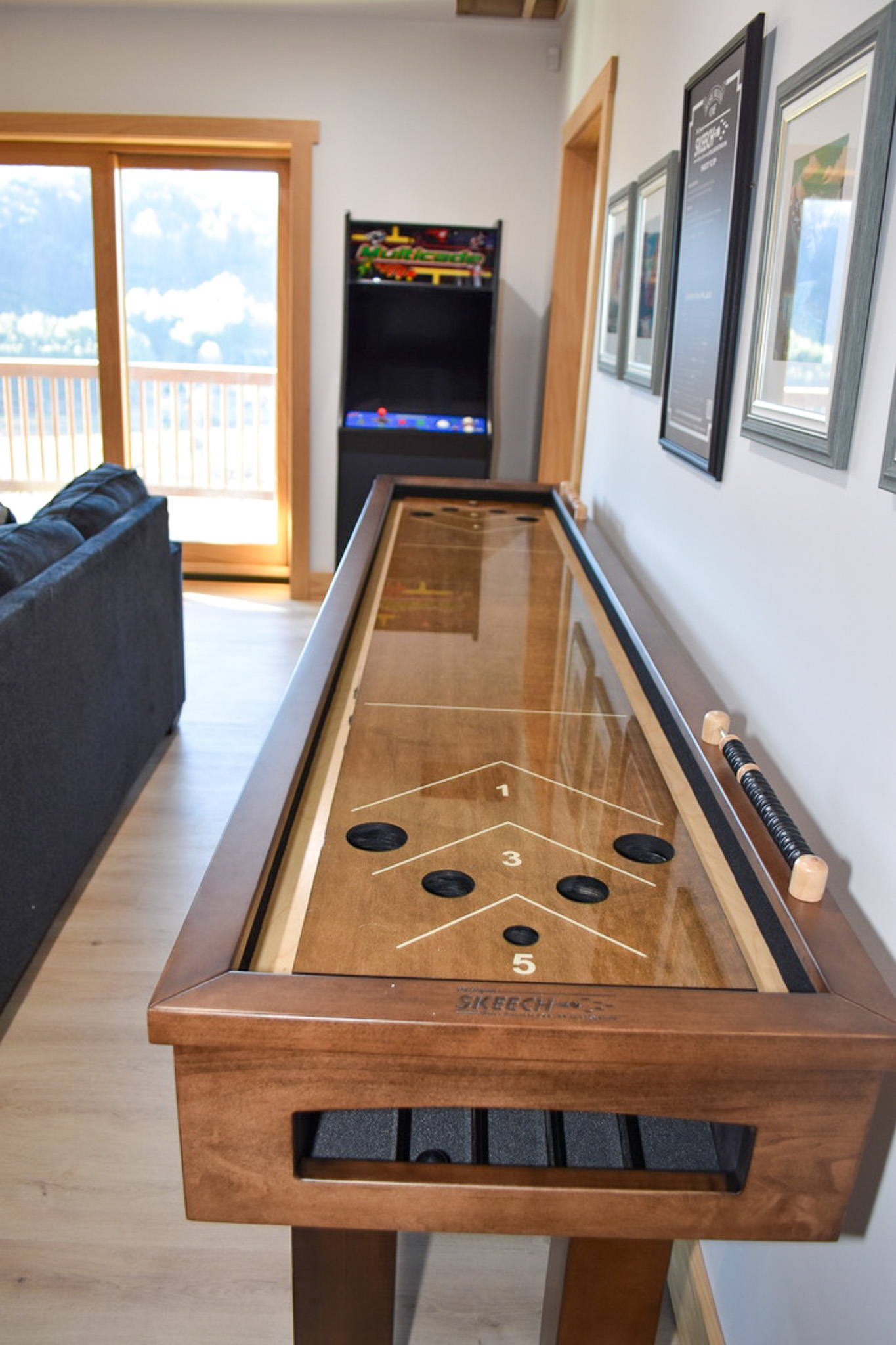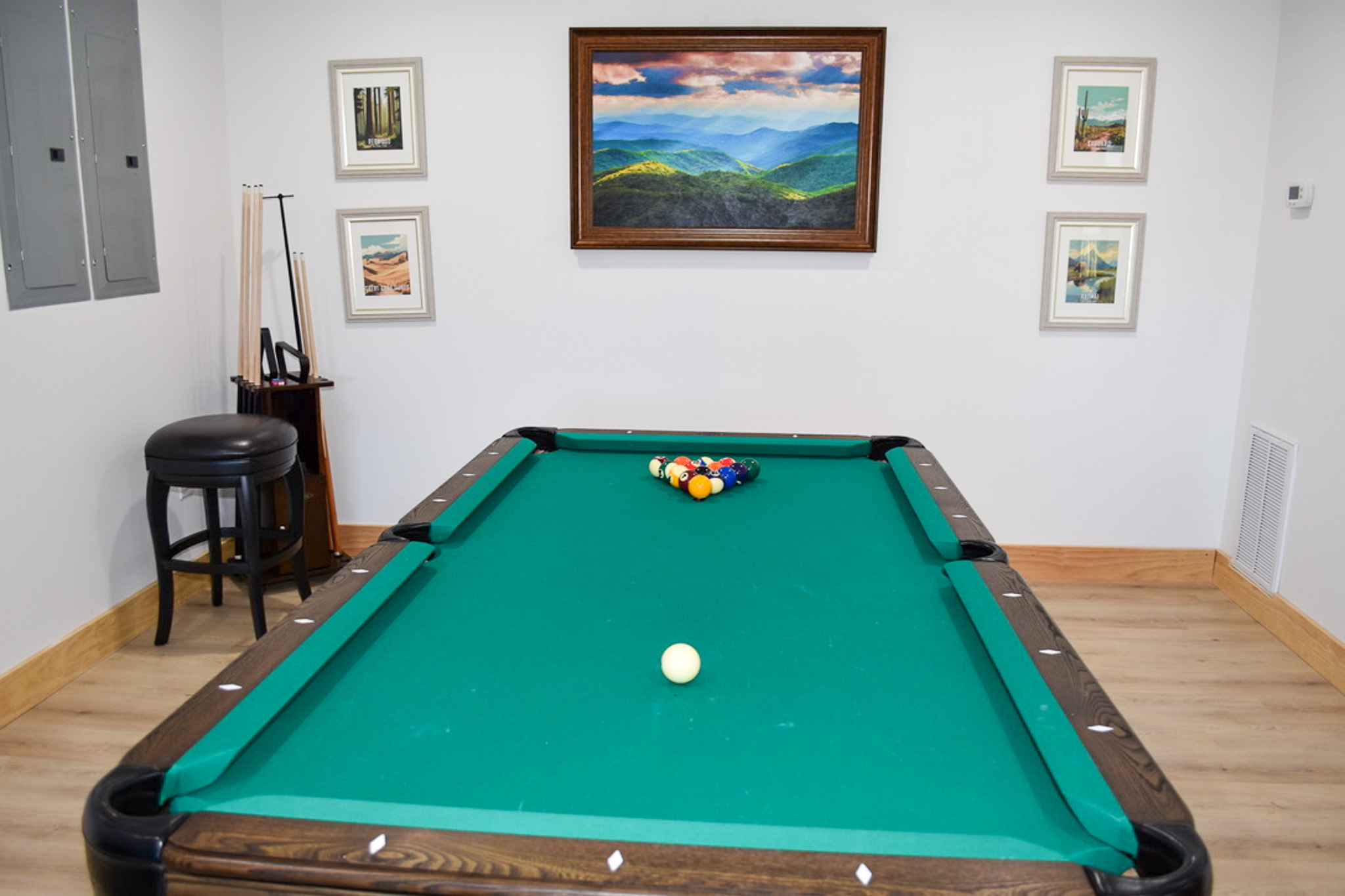 The lower level is designed for both fun and relaxation. A welcoming game lounge features a vintage arcade game, pool table, and skee-ball, centered around another large flat-screen TV—perfect for evenings together. This level also includes two additional bedrooms, one with a queen bed and the other with two double beds, along with a shared hall bathroom and a conveniently located laundry room.