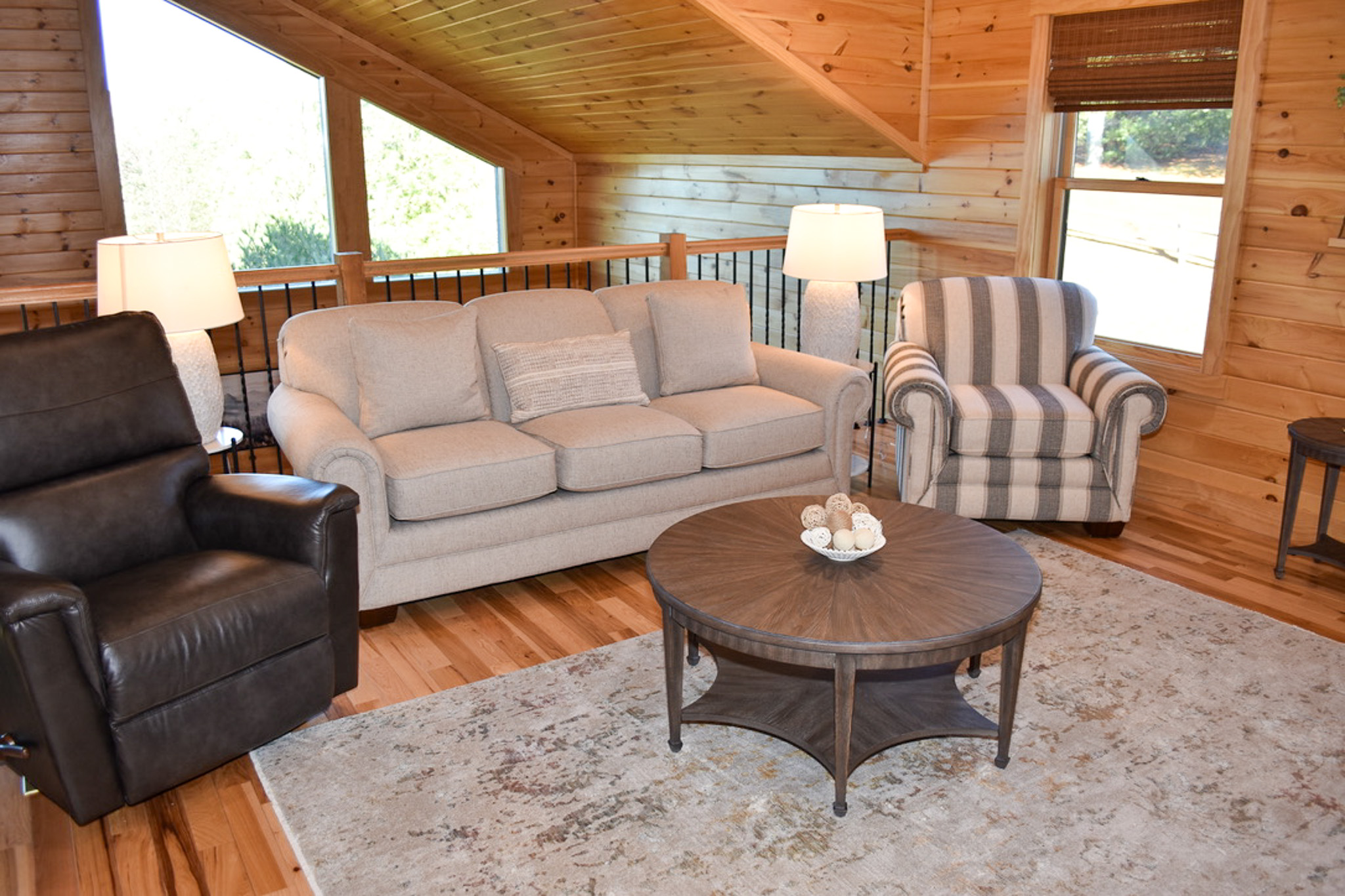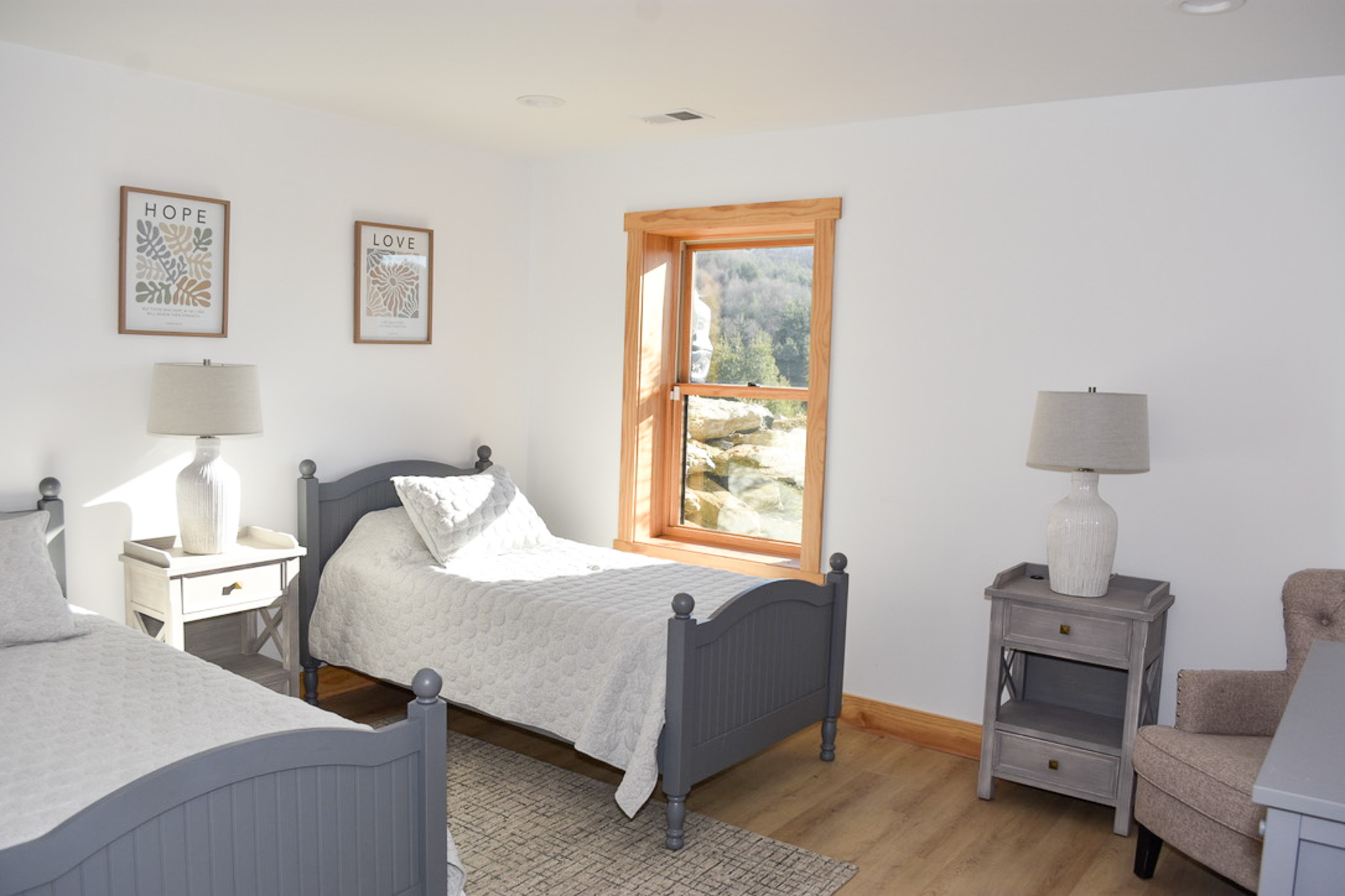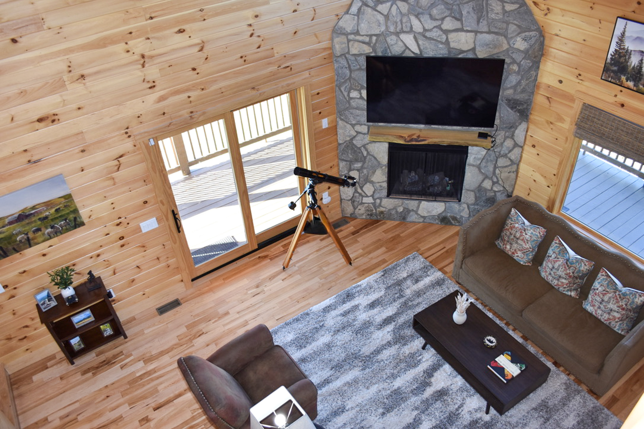 Upstairs, a charming loft overlooking the main living area offers a cozy space for reading, crafts, or watching a favorite show on the flat-screen TV. Two spacious bedrooms with vaulted ceilings and tasteful furnishings share a full bath—one offering two twin beds, the other a comfortable queen.