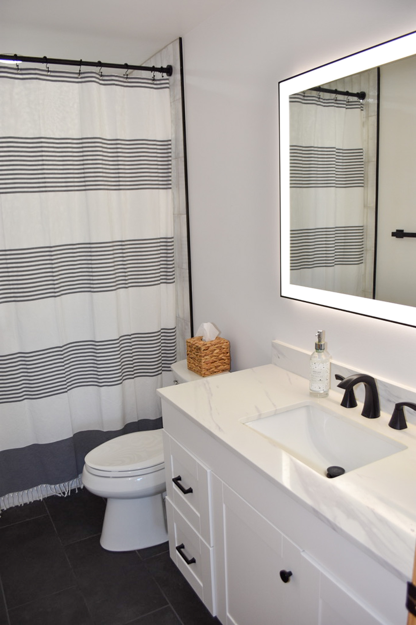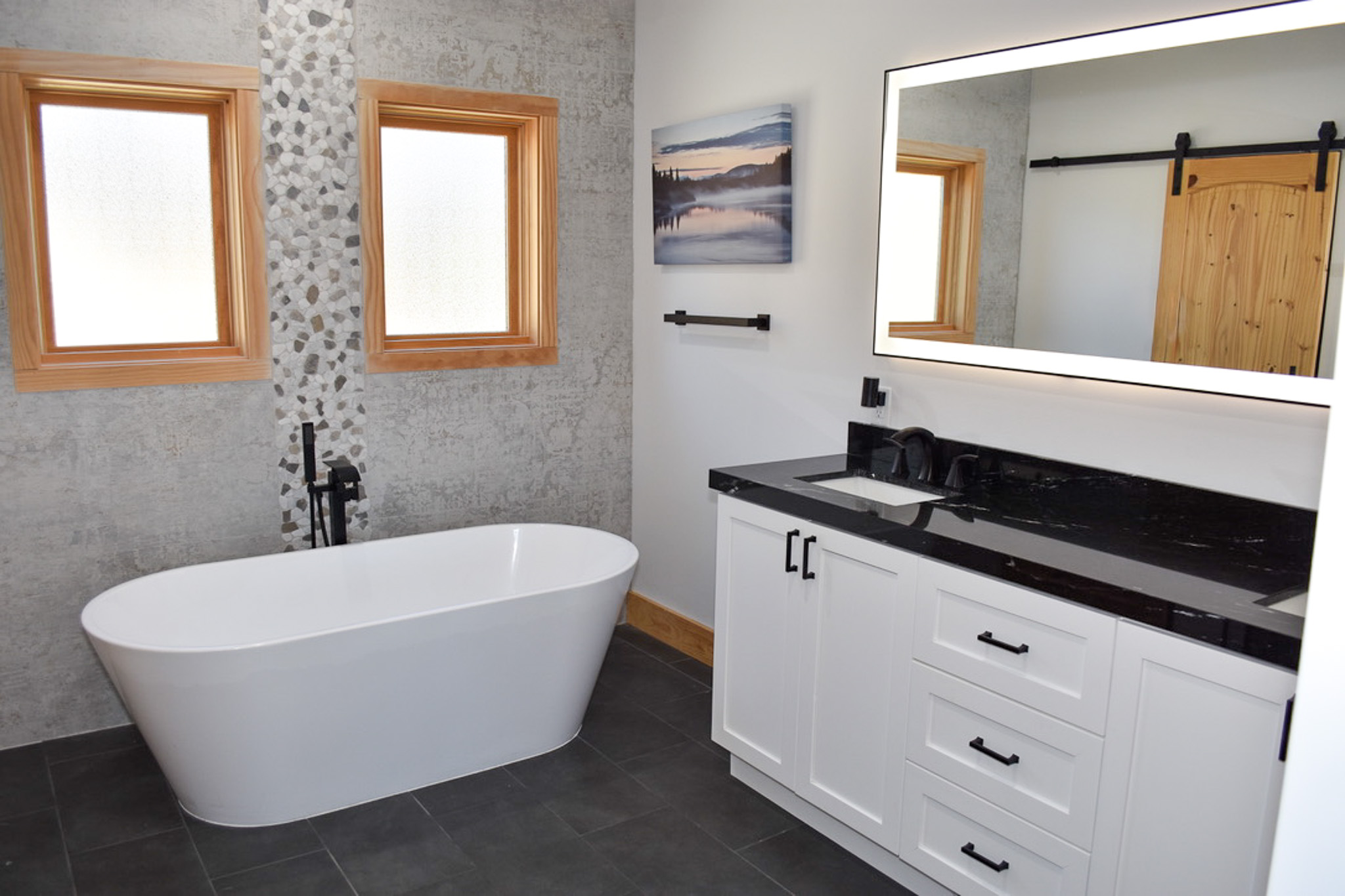 The primary suite on the main level is a serene retreat, complete with private deck access, a king bed, walk-in closet, and a luxurious en suite bath with a soaking tub and separate glass-enclosed shower. A convenient half bath is also located on this level for guests.